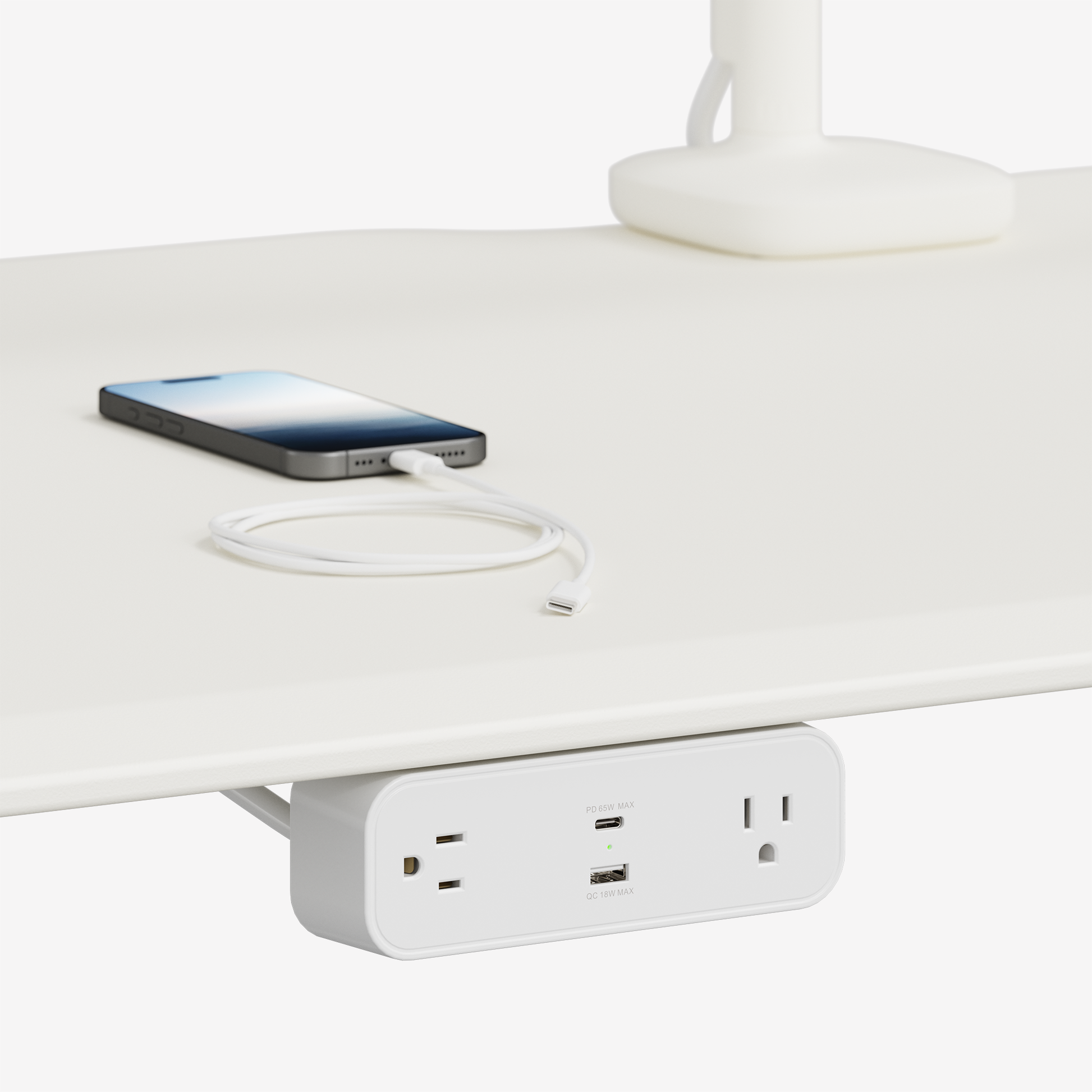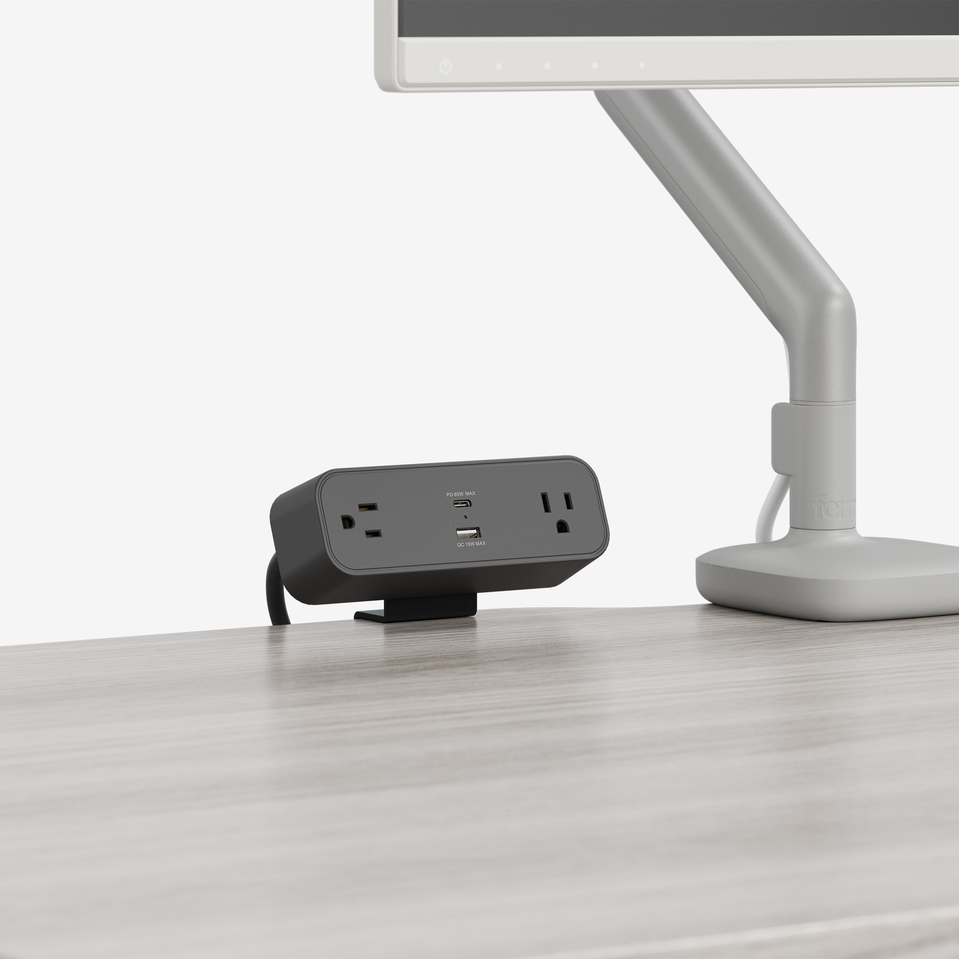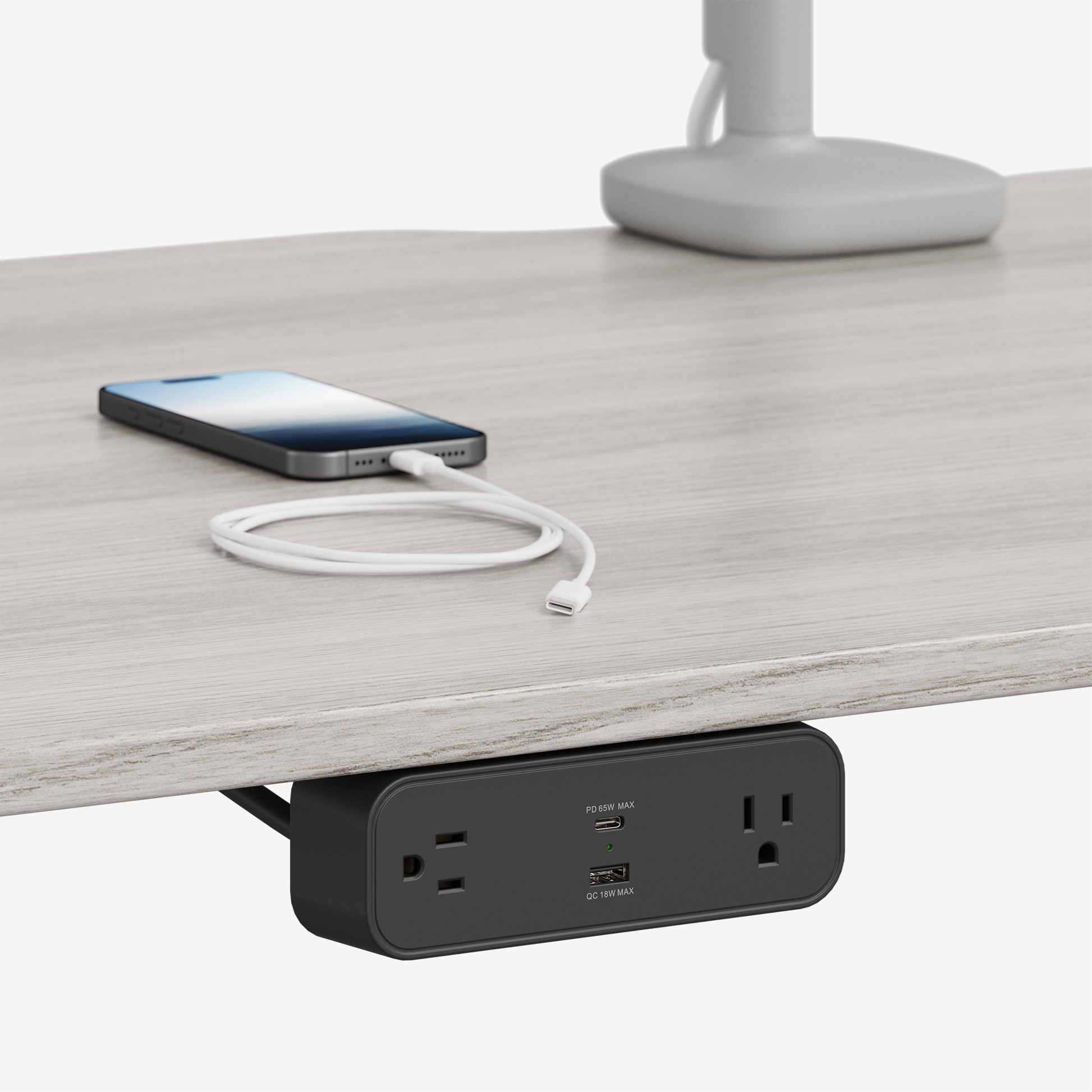 Organize and PowerUp. The Clean Slate Powerup is a streamlined workspace essential. With 2 AC outlets, 1 USB-A port, and 1 USB-C port, you can easily power and fast charge your devices. Its flexible mounting design–including clamp and under-desk hardware–allows for effortless installation on any worktop. Pair with the Clean Slate Cable Caddy for seamless cable management.