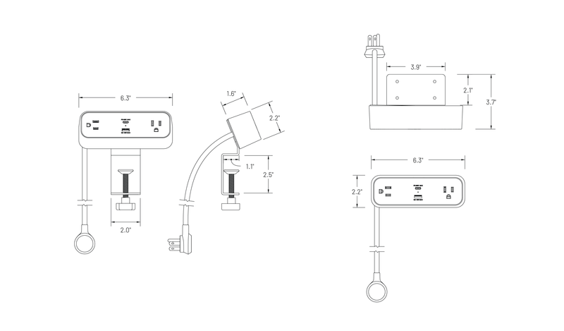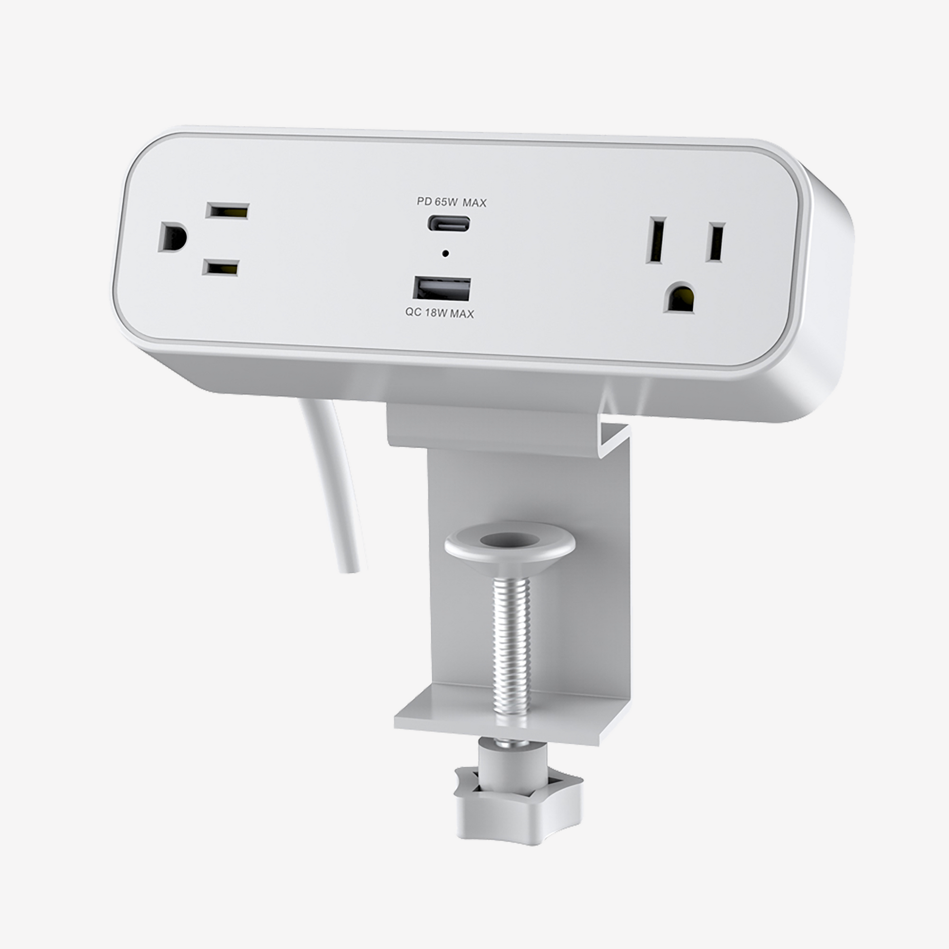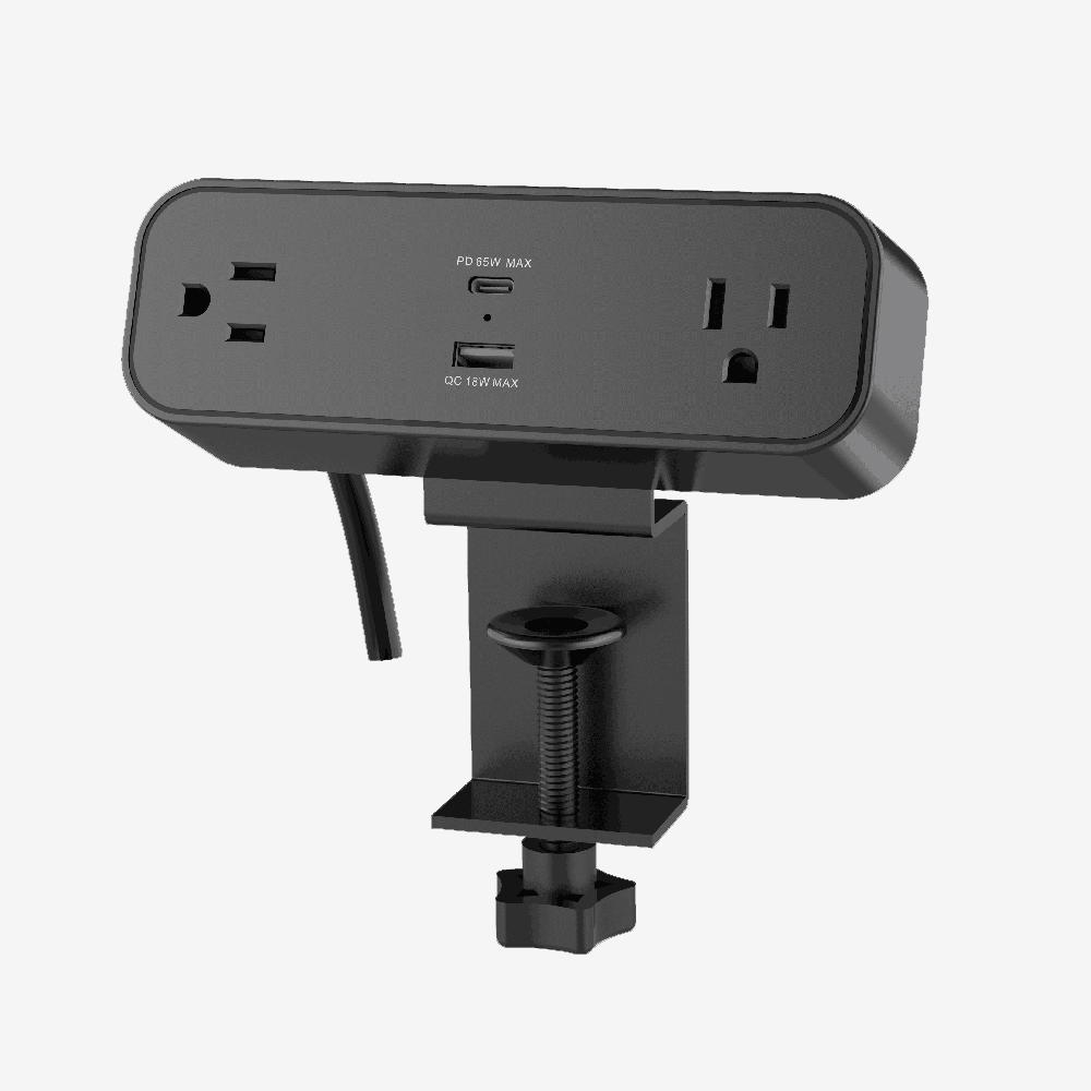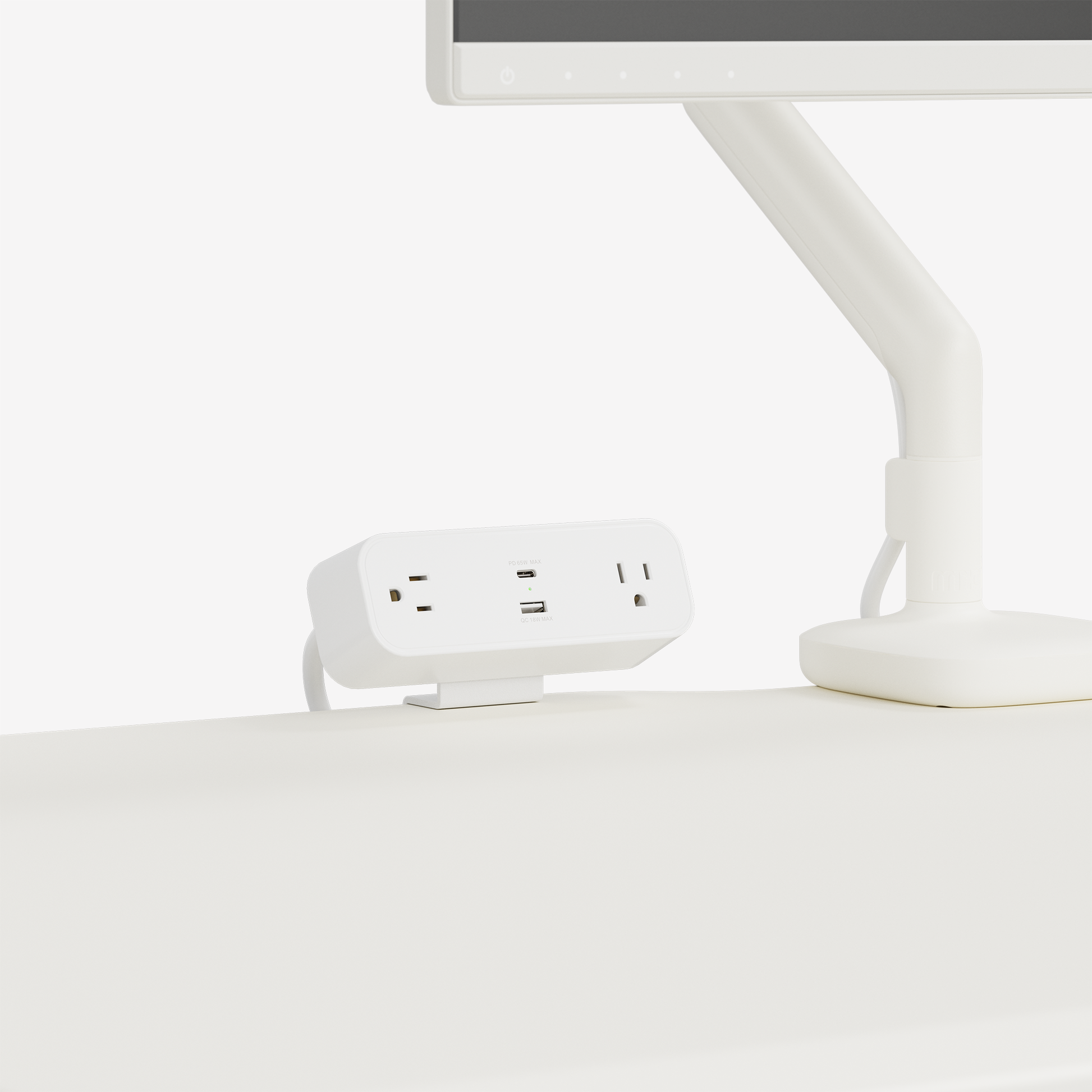 Organize and PowerUp. The Clean Slate Powerup is a streamlined workspace essential. With 2 AC outlets, 1 USB-A port, and 1 USB-C port, you can easily power and fast charge your devices. Its flexible mounting design–including clamp and under-desk hardware–allows for effortless installation on any worktop. Pair with the Clean Slate Cable Caddy for seamless cable management.